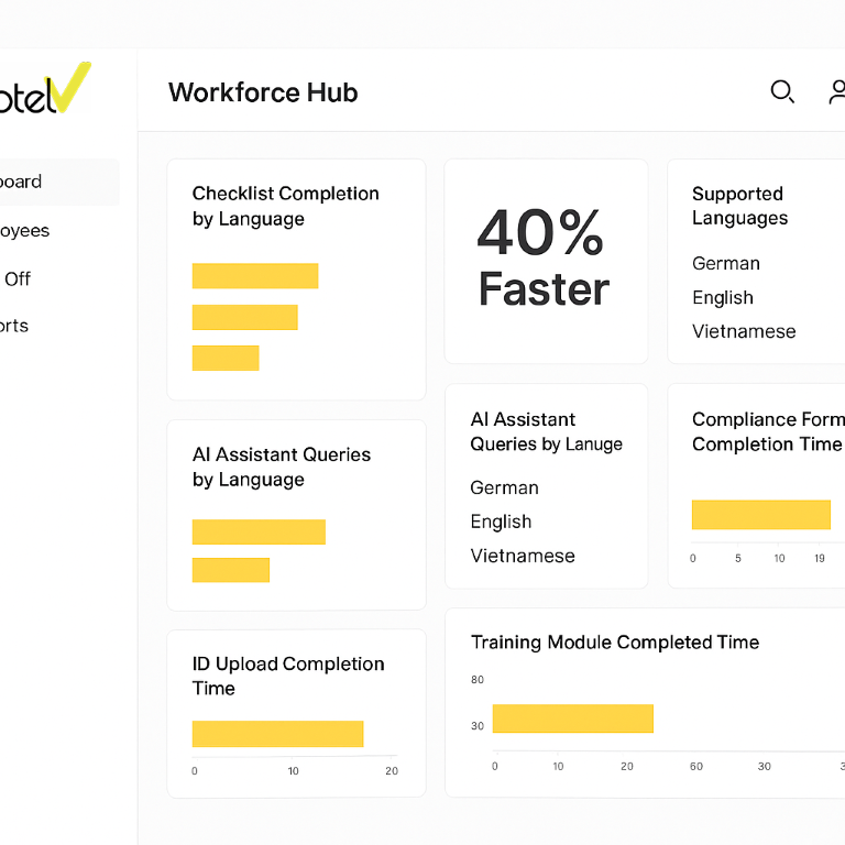 Workforce Hub offers onboarding checklists automatically translated into German, English, Vietnamese, or any configured language. An in-app AI assistant answers questions in the user’s preferred language, guiding them through ID uploads, training modules, and compliance forms. Hotels report 40% faster first-day readiness and a significant drop in early turnover.